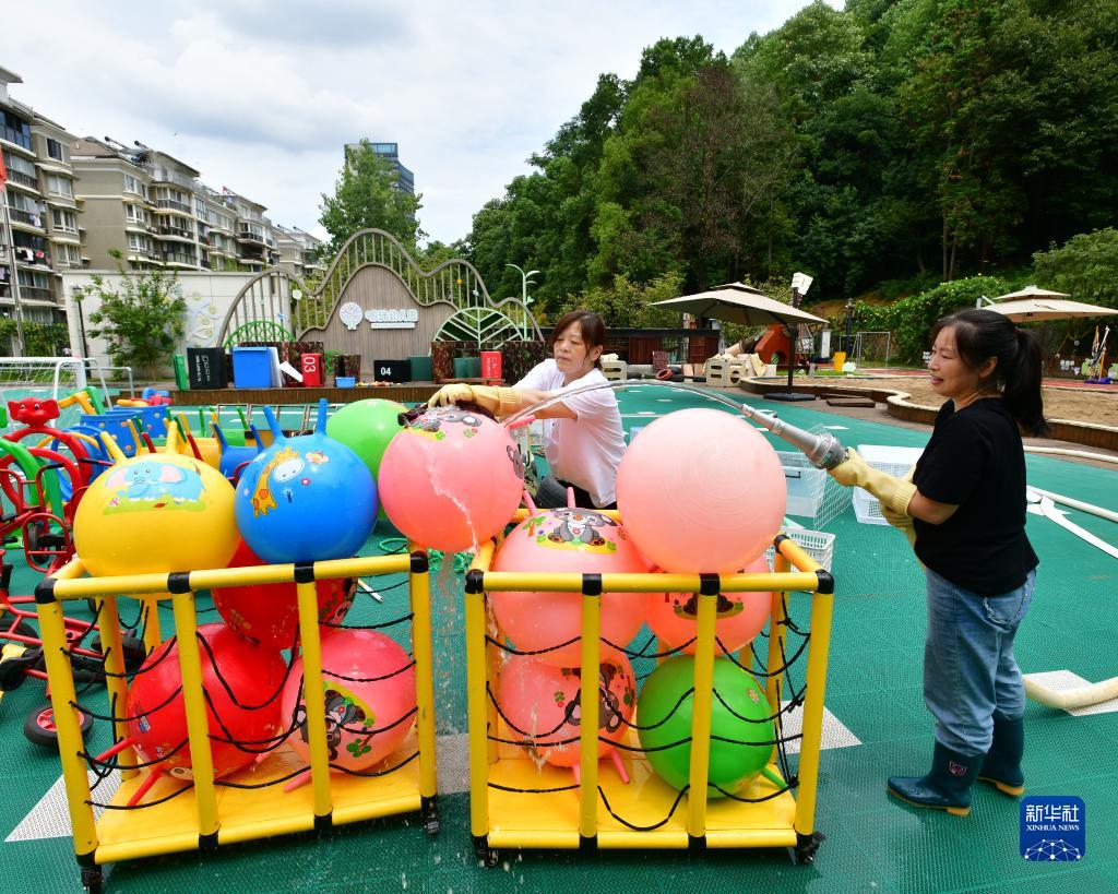 8月27日,工作人員在浙江省建德市明珠幼兒園操場(chǎng)上清洗兒童玩具。