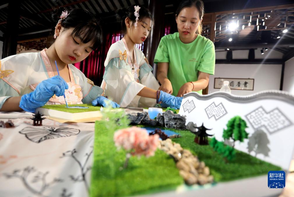 8月27日,小朋友在江蘇蘇州園林博物館體驗園林模型搭建。