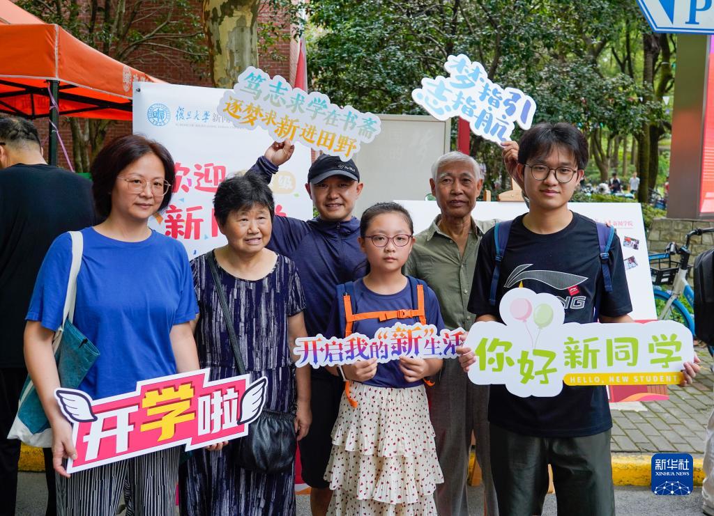 8月27日,復旦大學(xué)新生(右一)在新聞學(xué)院的迎新攤位前與家人合影。
