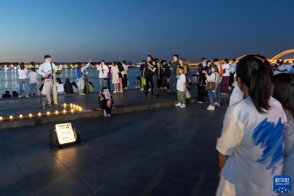 8月27日,歌手在松花江哈爾濱段江畔的斯大林公園唱歌。