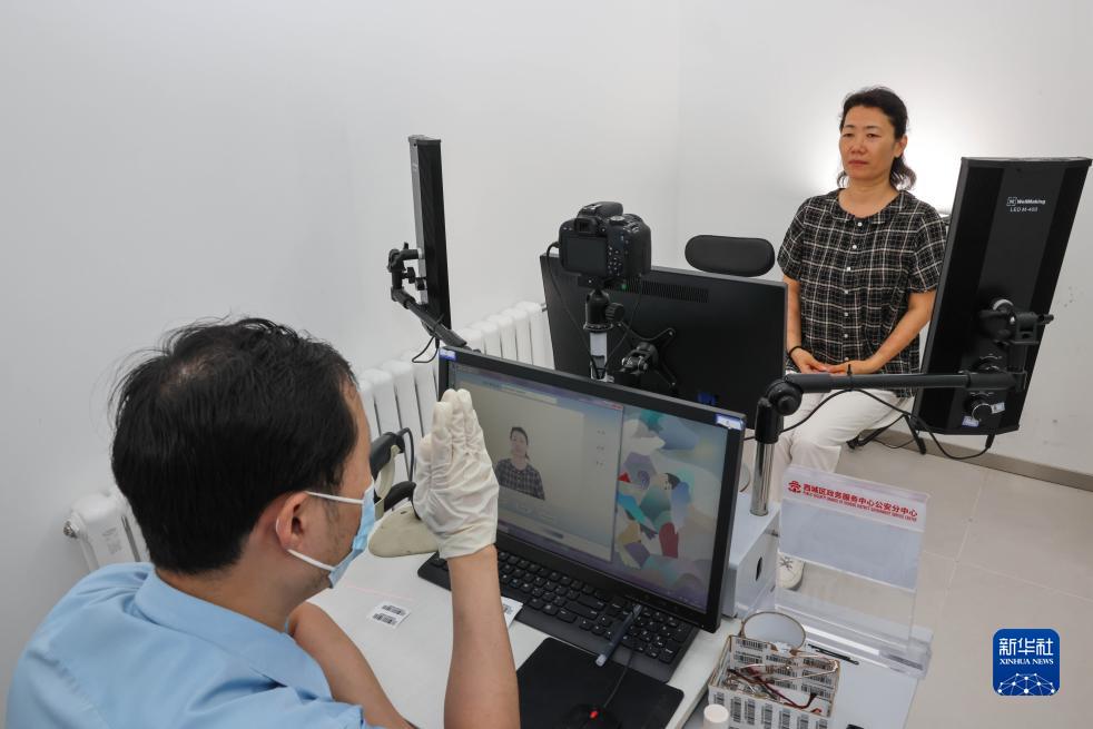 8月25日,在北京市公安局西城分局出入境接待大廳,工作人員在給一位女士拍證件照。