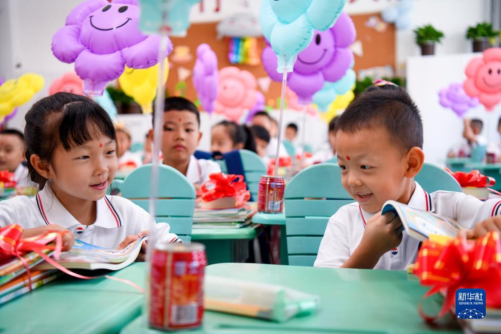 8月28日,在烏魯木齊市第76小學(xué),一年級新生翻閱新書(shū)。