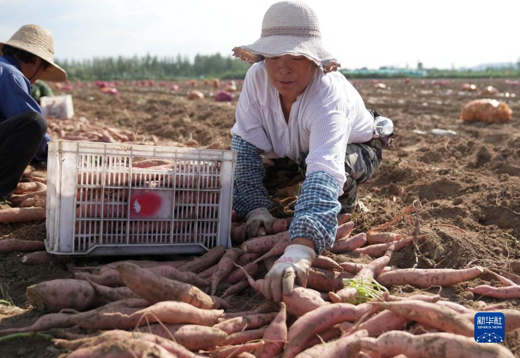 8月28日,灤州市九百戶(hù)鎮一家鮮食紅薯種植合作社的社員在田間收獲煙薯。