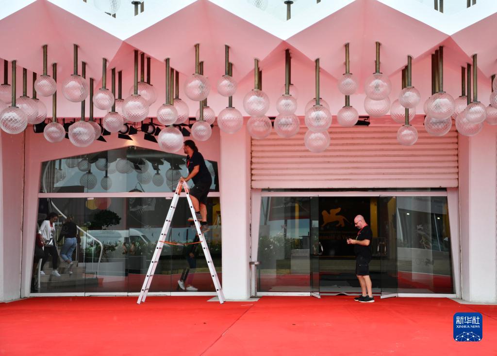 8月29日,在意大利威尼斯利多島,工作人員在電影節開(kāi)幕式紅毯區域做準備。