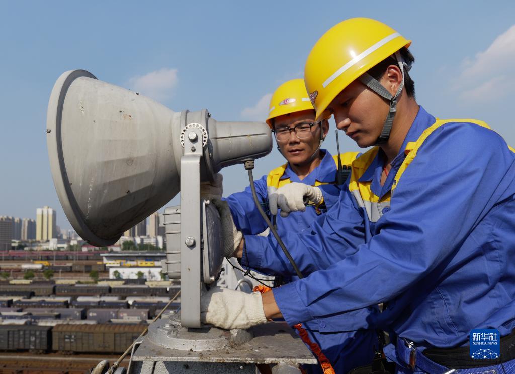 8月29日,中國鐵路鄭州局集團有限公司鄭州供電段工作人員在鄭州北站編組場(chǎng)的燈橋上檢修投光燈。
