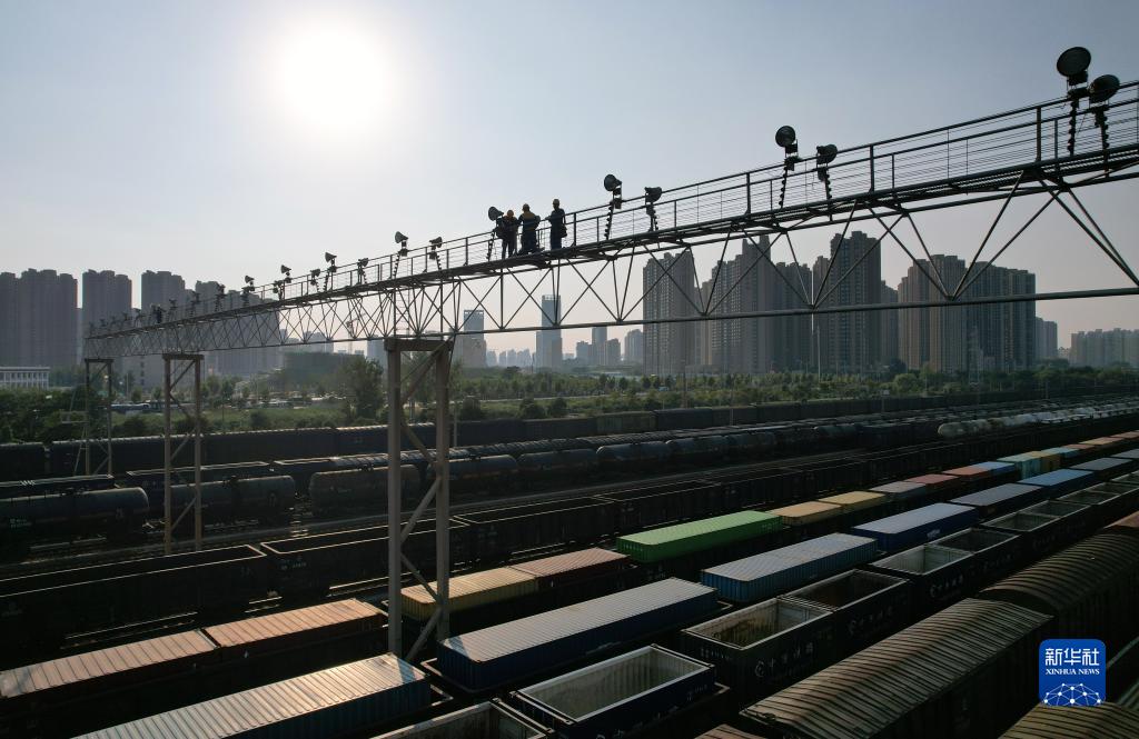 8月29日,中國鐵路鄭州局集團有限公司鄭州供電段工作人員在鄭州北站編組場(chǎng)的燈橋上檢修投光燈(無(wú)人機照片)。