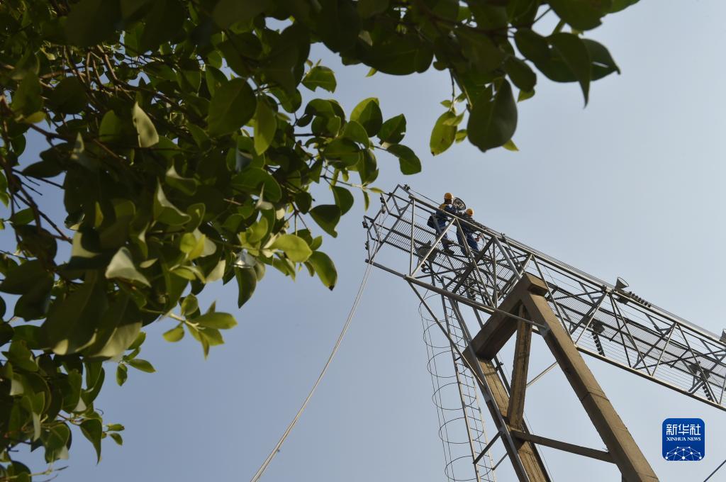 8月29日,中國鐵路鄭州局集團有限公司鄭州供電段工作人員在鄭州北站編組場(chǎng)的燈橋上檢修投光燈。