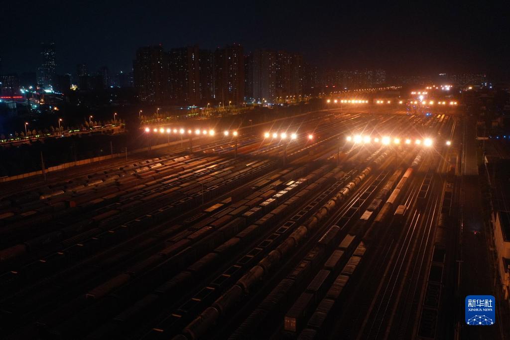8月29日晚拍攝的投光燈照耀下的鄭州北站編組場(chǎng)(無(wú)人機照片)。