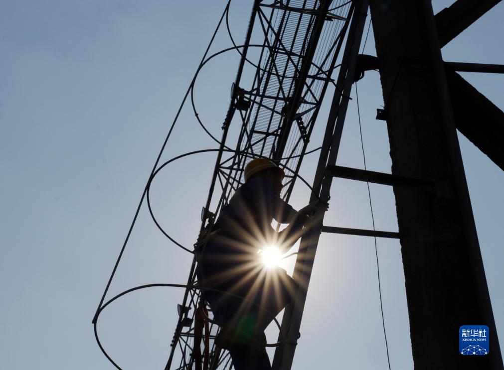 8月29日,中國鐵路鄭州局集團有限公司鄭州供電段工作人員在鄭州北站編組場(chǎng)內攀爬燈橋。