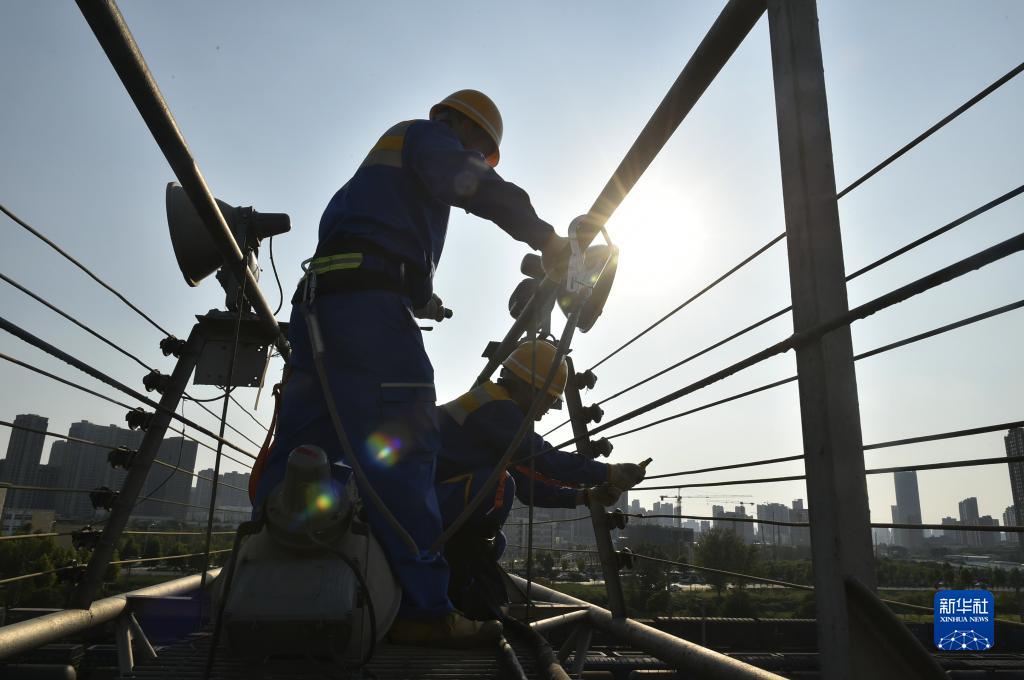 8月29日,中國鐵路鄭州局集團有限公司鄭州供電段工作人員在鄭州北站編組場(chǎng)的燈橋上檢修投光燈。