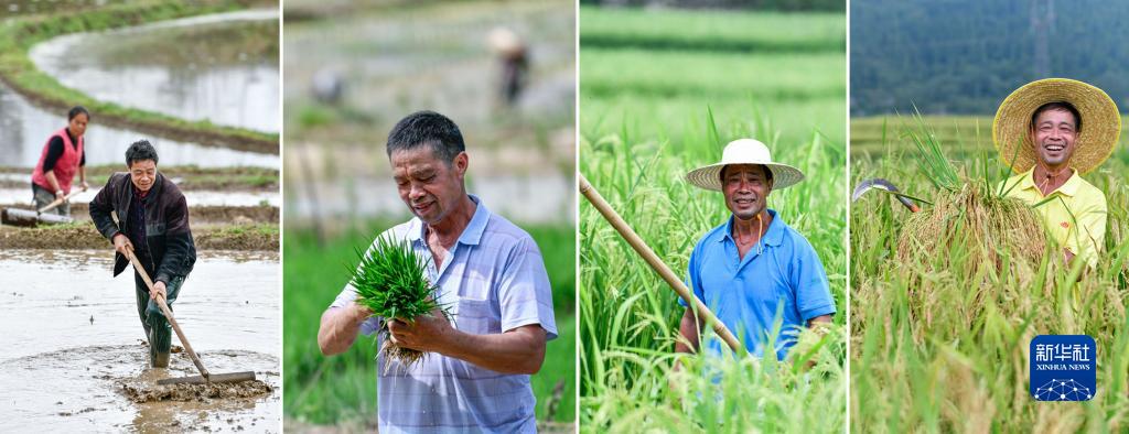 拼版照片:從左至右為4月6日,為陳良東在水稻制種基地里平整田塊,準備播種;5月29日,陳良東在移栽秧苗;8月1日,陳良東在水稻制種基地里拿著(zhù)竹竿,準備給制種水稻“趕花”授粉;8月26日,陳良東展示收獲的水稻種子。