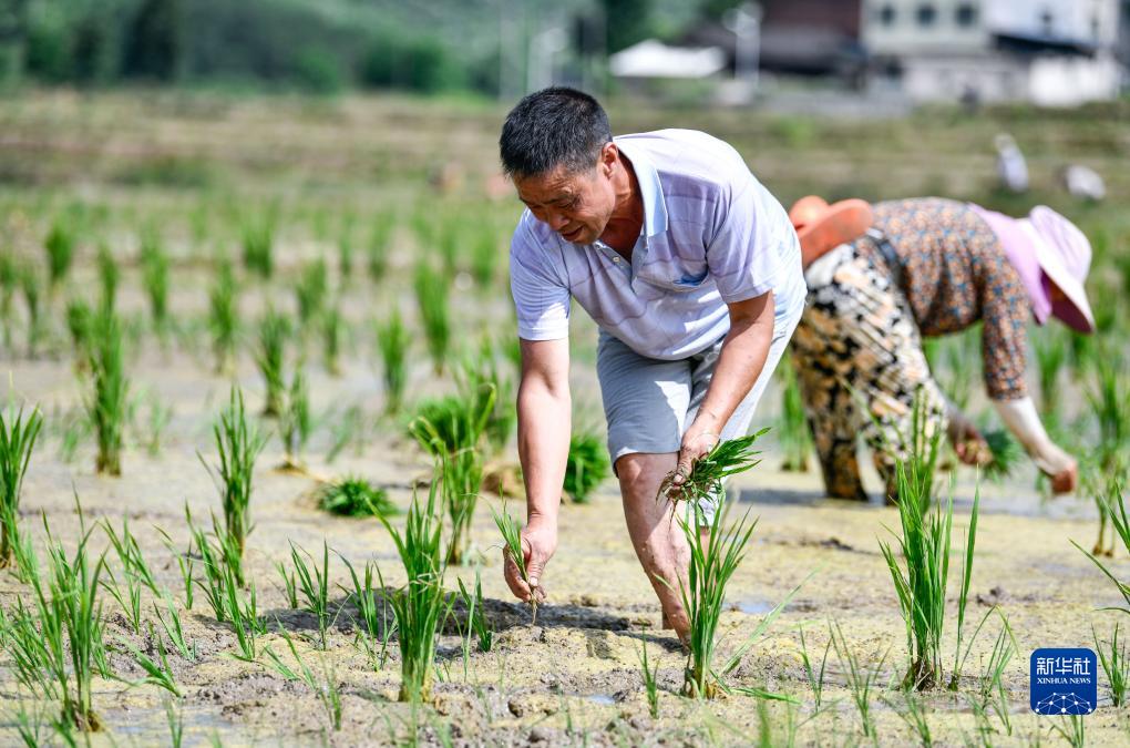 陳良東(前)與村民在水稻制種基地里插秧(5月29日攝)。