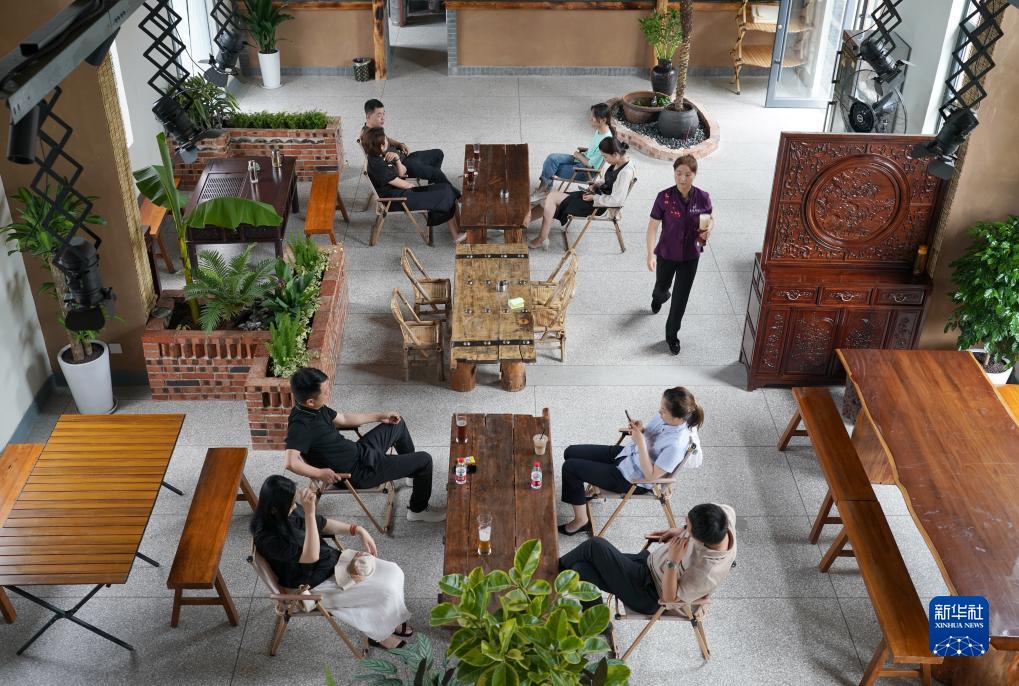 游客在秦嶺北麓腳下的西安市周至縣馬召鎮辛口村一家驛站內休閑(7月14日攝)。