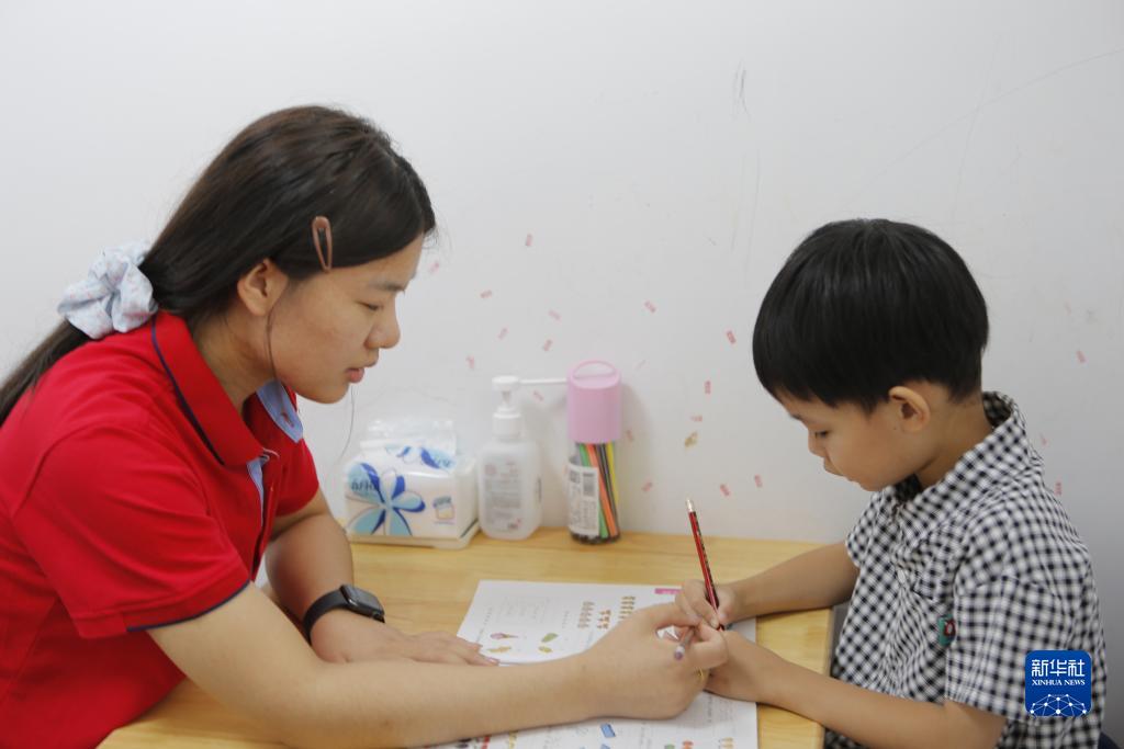 8月30日,在江蘇揚州寶應縣小天使幼兒園,小朋友在老師指導下學(xué)習。