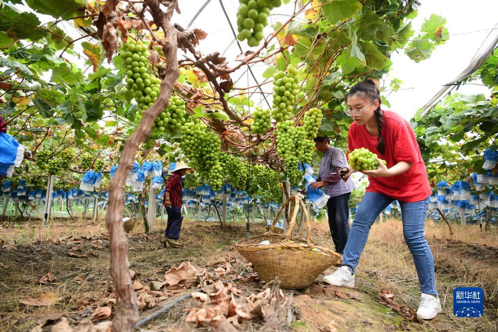 8月30日,潘雅潔(右一)在肥西縣紫蓬鎮的葡萄園里采摘葡萄。