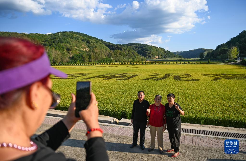 8月29日,游客在陜西延安南泥灣國家濕地公園的稻田前留影。