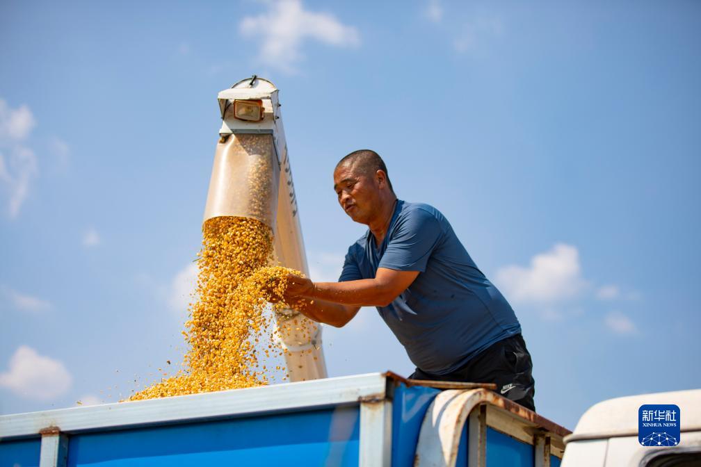 8月30日,在山東省東營(yíng)市廣饒縣李鵲鎮的萬(wàn)畝優(yōu)質(zhì)糧食智能示范區,農民把收獲的玉米裝車(chē)。