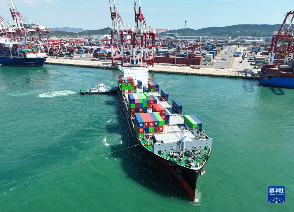8月30日,“中外運??凇陛喚従忨傠x山東港口青島港(無(wú)人機照片)。