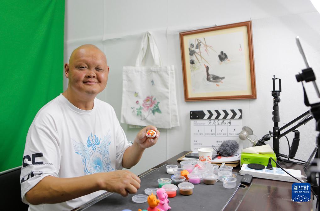 8月30日,在江蘇揚州小滿(mǎn)助殘就業(yè)創(chuàng )業(yè)基地,一名殘疾人士展示剛剛制作完成的手工藝品。