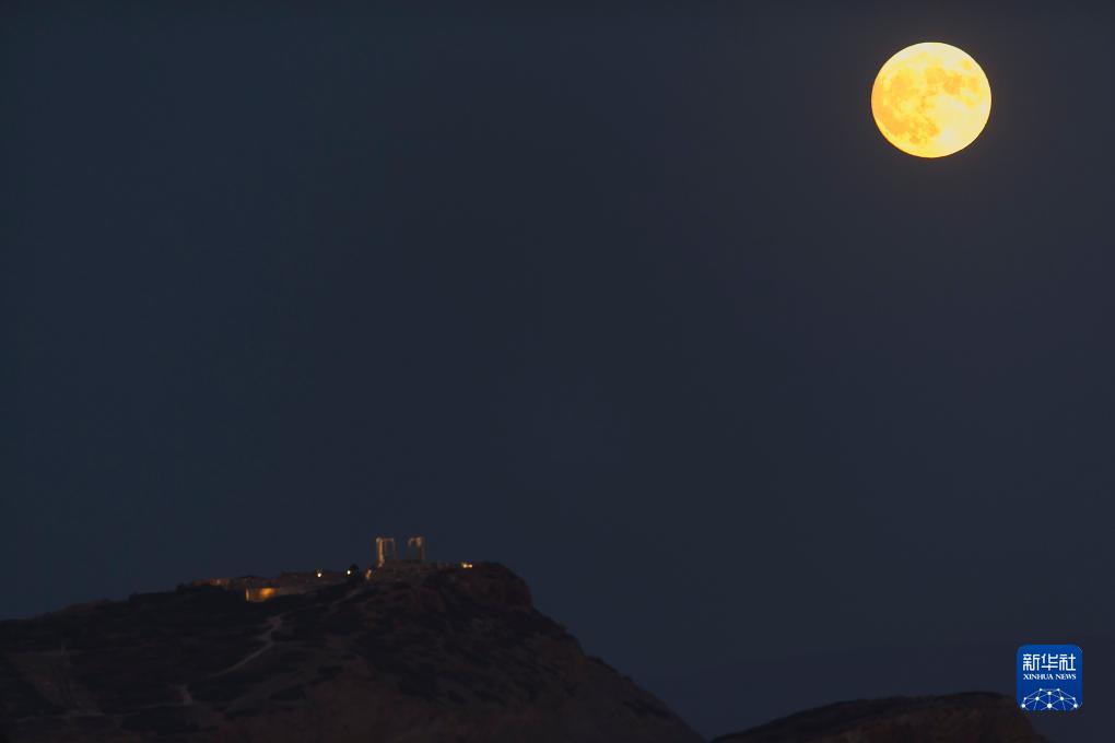 8月30日,“超級月亮”從希臘蘇尼翁角的波塞冬廟上空升起。