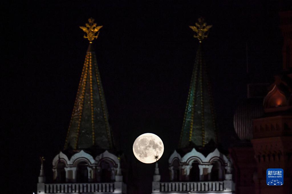 這是8月30日在俄羅斯首都莫斯科紅場(chǎng)附近拍攝的“超級月亮”。