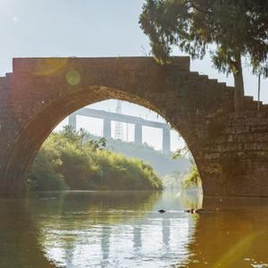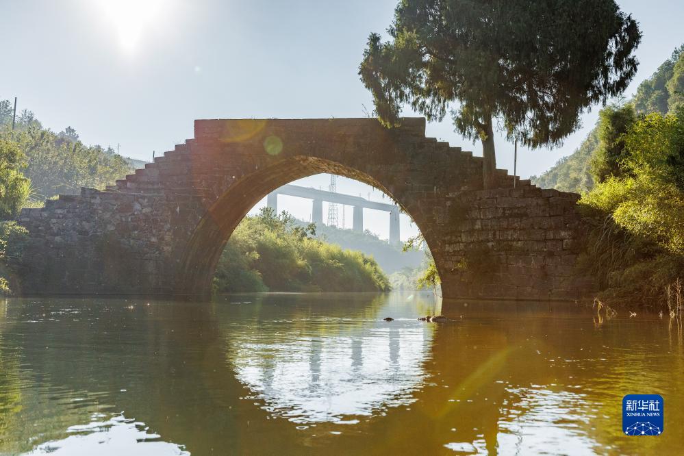 8月31日,一列動(dòng)車(chē)組在晨曦中經(jīng)過(guò)貴南高鐵銀坡河特大橋,前為建于清代光緒年間的蒙家橋。