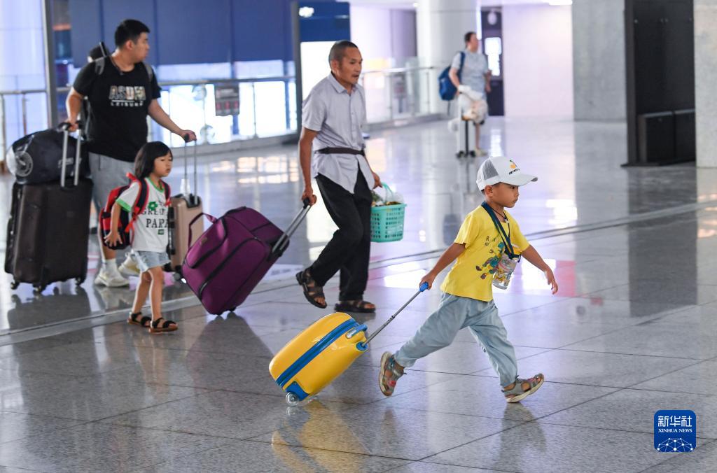 8月31日,小朋友拉著(zhù)行李箱在重慶火車(chē)北站候車(chē)室候車(chē)。