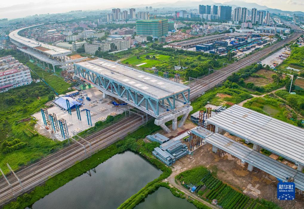 8月31日,莞番高速上跨廣深鐵路主橋轉體完成(無(wú)人機照片)。