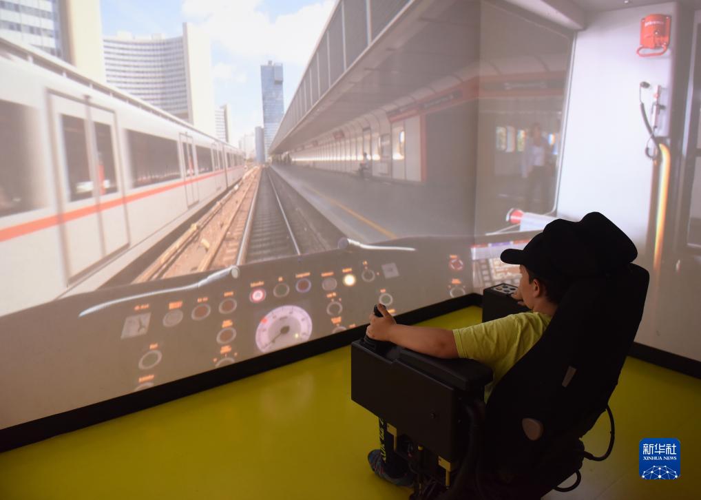 8月30日,在奧地利維也納交通博物館,觀(guān)眾模擬體驗地鐵列車(chē)駕駛。