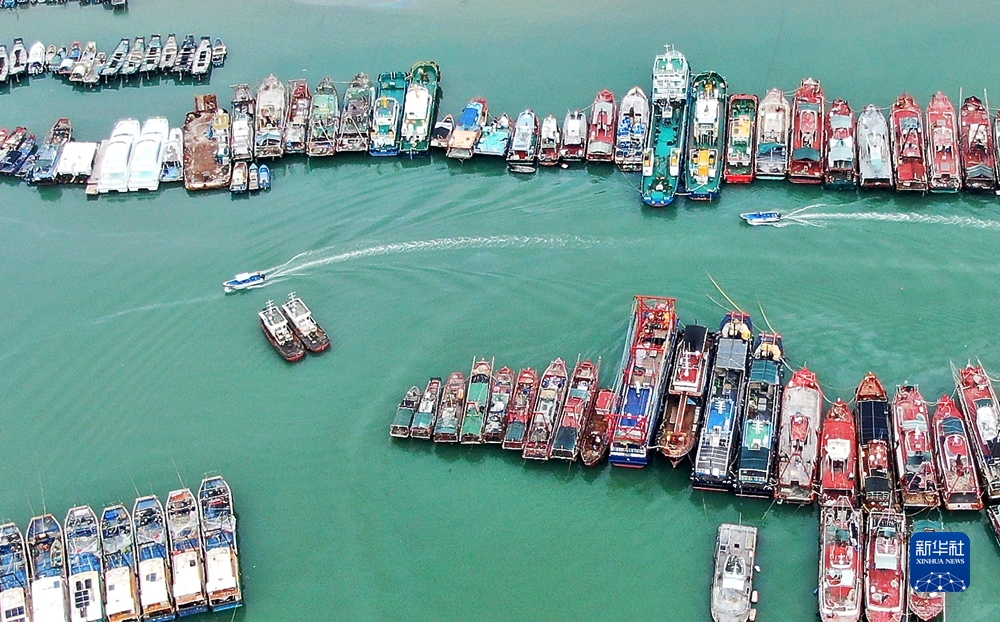 8月31日,在廣東省汕尾港避風(fēng)塘,漁船歸港避風(fēng)(無(wú)人機照片)。