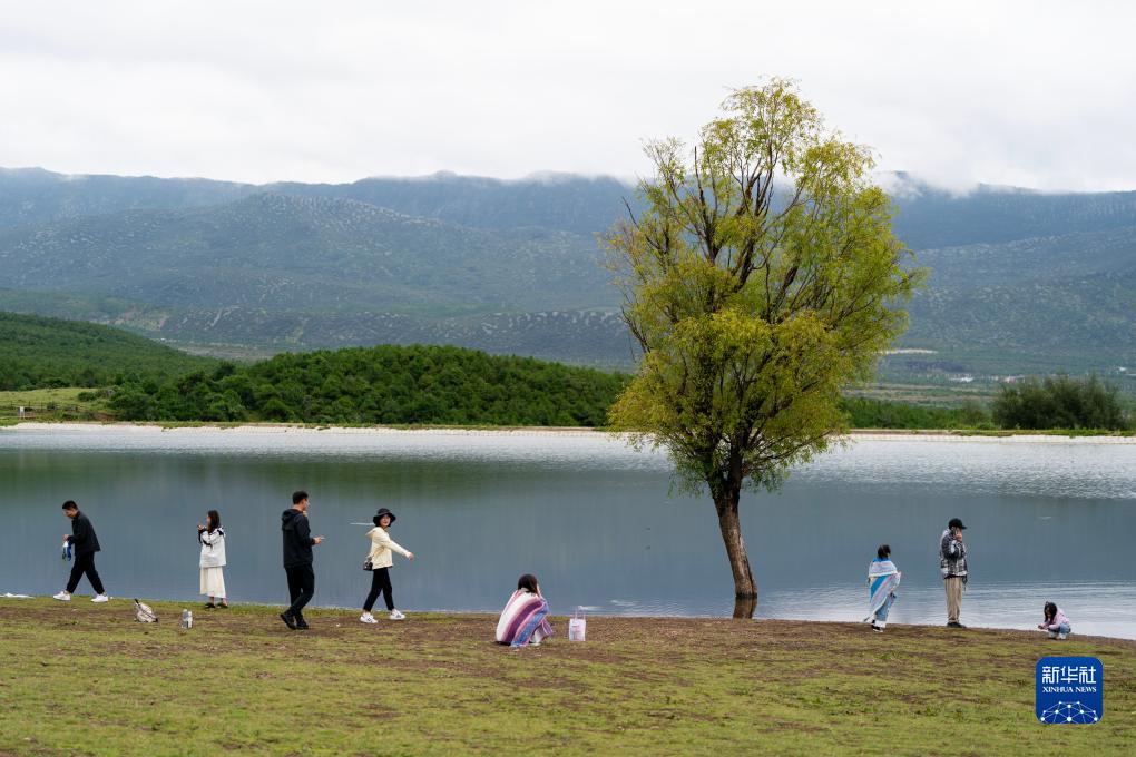 游客在麗江市玉龍納西族自治縣白沙鎮玉湖村龍女湖邊休閑游玩(8月28日攝)。