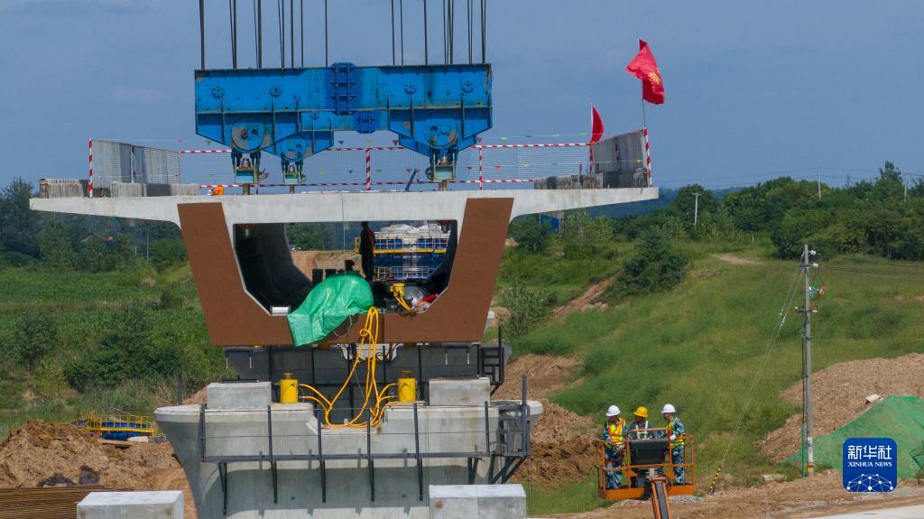 8月31日,工人在吊裝滬渝蓉高鐵滬寧段首榀箱梁(無(wú)人機照片)。