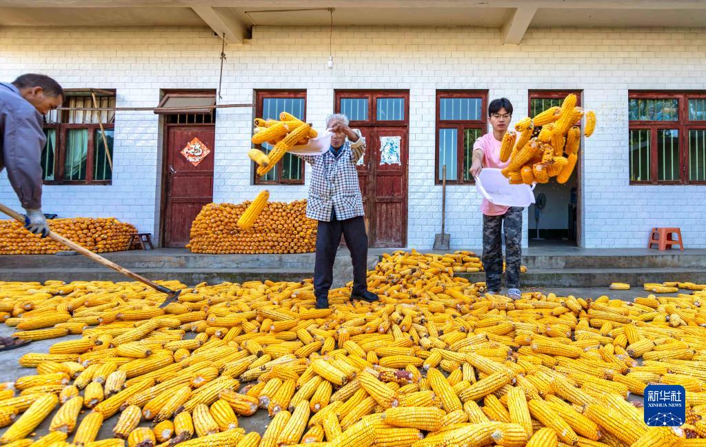 8月31日,村民在貴州省黔西市觀(guān)音洞鎮觀(guān)音洞社區晾曬玉米。