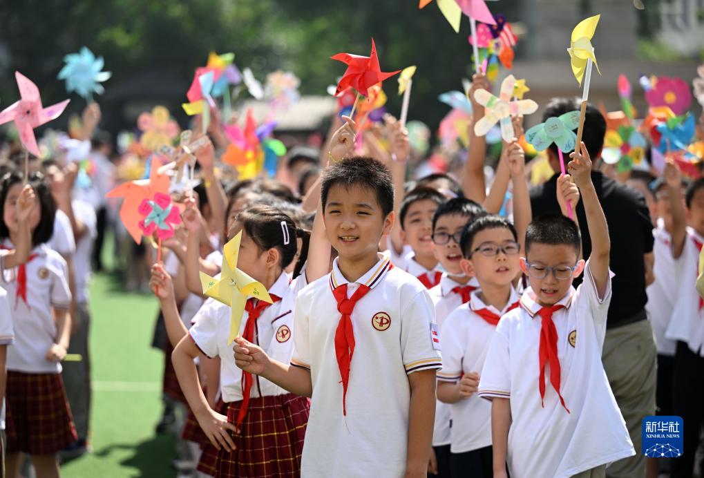 9月1日,在天津市和平區中心小學(xué),學(xué)生們在開(kāi)學(xué)典禮上旋轉自己制作的風(fēng)車(chē)。