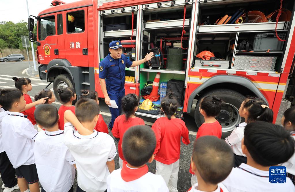 9月1日,在福建省龍巖市第二實(shí)驗小學(xué),新生在消防員的講解下了解消防車(chē)輛器材知識。