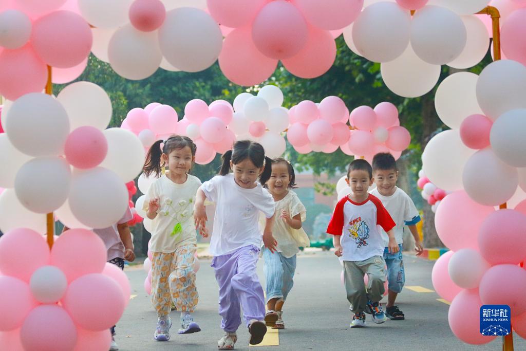 9月1日,在山東省高密市金蘋(píng)果幼兒園,孩子們在校園內奔跑。