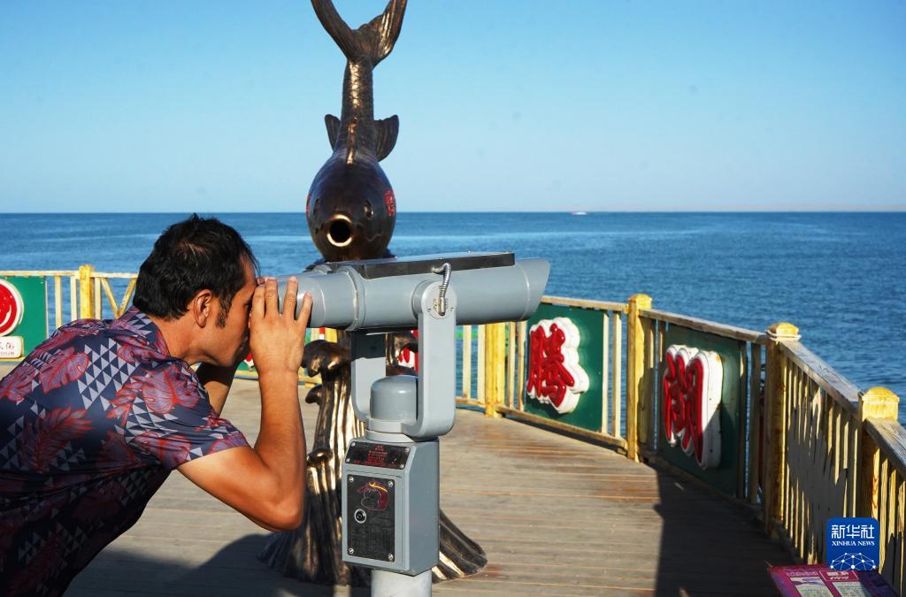 8月31日,在新疆博斯騰湖大河口景區,游客使用望遠鏡觀(guān)察遠方。