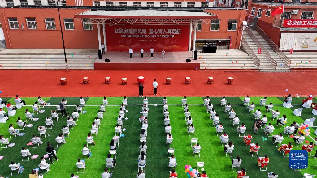 9月1日,在北京市房山區霞云嶺鄉霞云嶺中心小學(xué),老師和學(xué)生在修繕一新的操場(chǎng)上參加開(kāi)學(xué)典禮(無(wú)人機照片)。