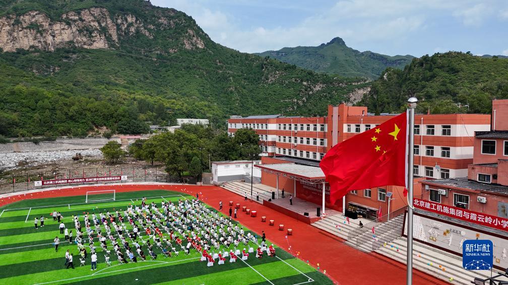9月1日,在北京市房山區霞云嶺鄉霞云嶺中心小學(xué),老師和學(xué)生在修繕一新的操場(chǎng)上參加開(kāi)學(xué)典禮(無(wú)人機照片)。