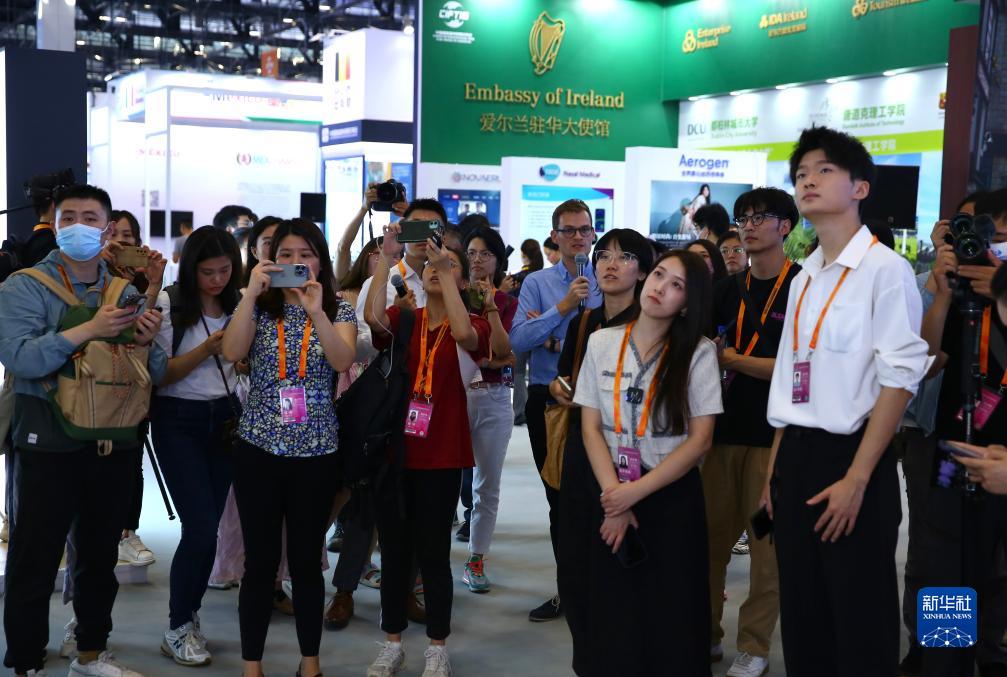 9月1日,參展商(中)在國家會(huì )議中心向媒體記者介紹展臺信息。