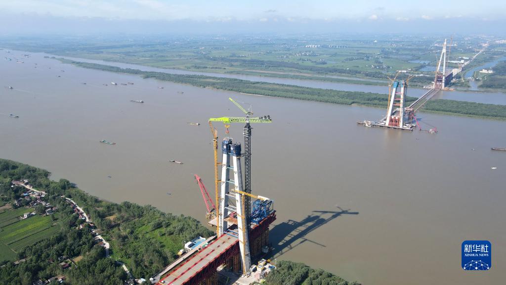 這是9月1日拍攝的中交二航局巢馬城際鐵路馬鞍山公鐵兩用長(cháng)江大橋南主塔首節段鋼塔吊裝現場(chǎng)(無(wú)人機照片)。