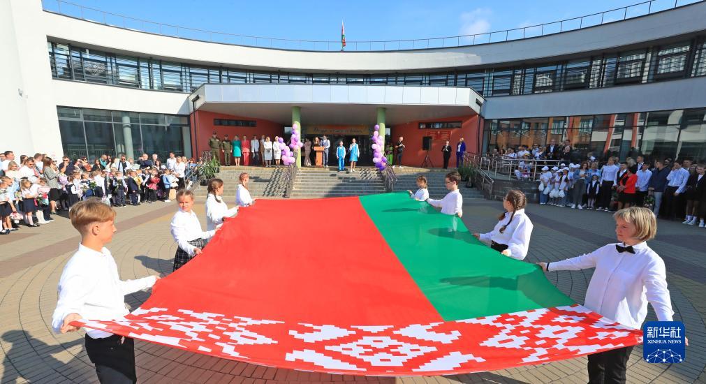 9月1日,學(xué)生在白俄羅斯首都明斯克一所學(xué)校參加開(kāi)學(xué)典禮。