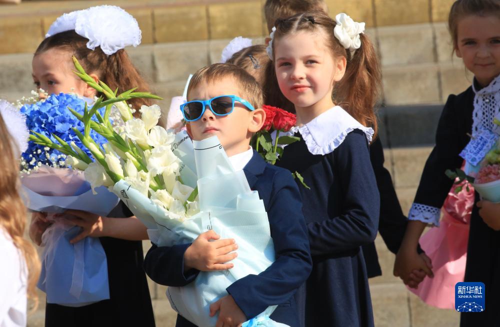 9月1日,學(xué)生在白俄羅斯首都明斯克一所學(xué)校參加開(kāi)學(xué)典禮。
