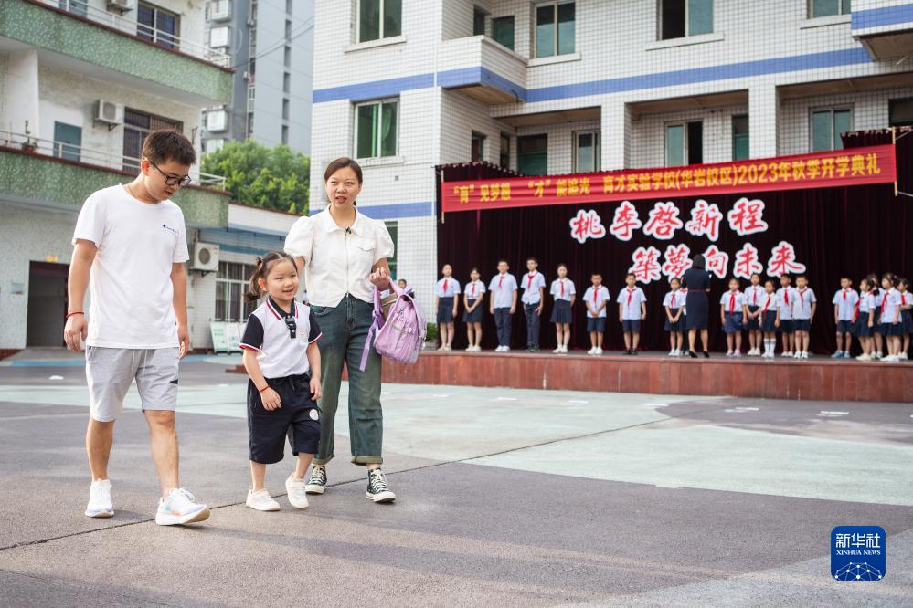 9月1日,在重慶育才實(shí)驗學(xué)校華巖校區,豆豆在爸爸媽媽的陪伴下走向教室。