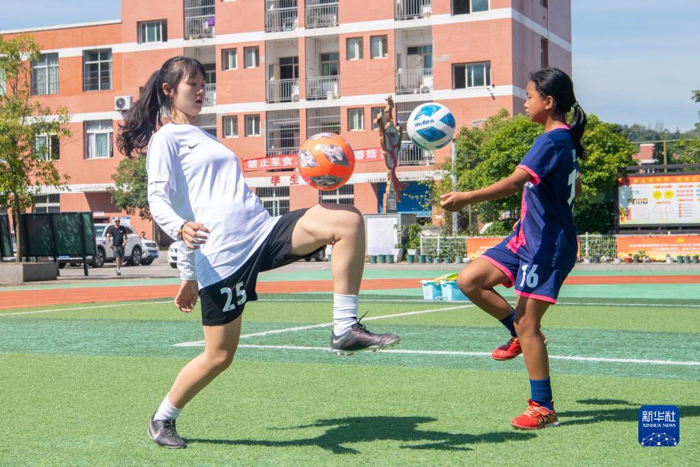 9月1日,在重慶市石柱縣三河鎮的三河小學(xué),秦芙蓉(左)和足球隊隊員在操場(chǎng)上練球。