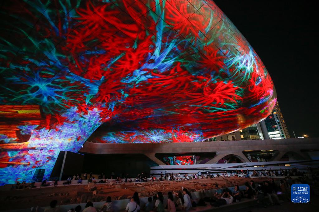 當日,大型新媒體藝術(shù)燈光秀“首爾之光·2023秋季”在韓國首爾東大門(mén)設計廣場(chǎng)亮相。燈光秀充分利用建筑的曲面外墻,融合煙霧、燈光、影像和音樂(lè ),吸引人們到現場(chǎng)參觀(guān)。該燈光秀將持續到9月10日。