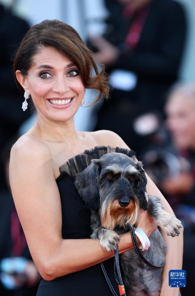 9月1日,在意大利威尼斯,演員卡泰麗娜·穆里諾抱著(zhù)寵物狗亮相電影《可憐的東西》首映式紅毯。