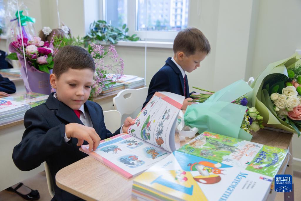 9月1日,俄羅斯圣彼得堡第362學(xué)校一年級學(xué)生在教室看課本。