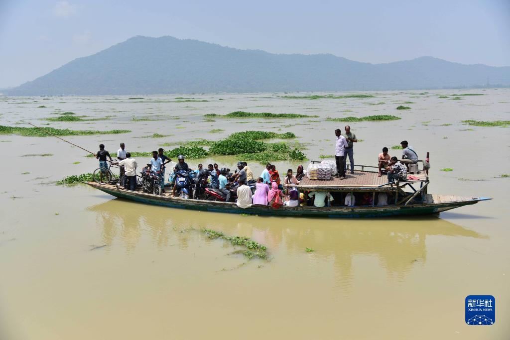 8月30日,人們在印度東北部阿薩姆邦一處洪災區域乘船出行。