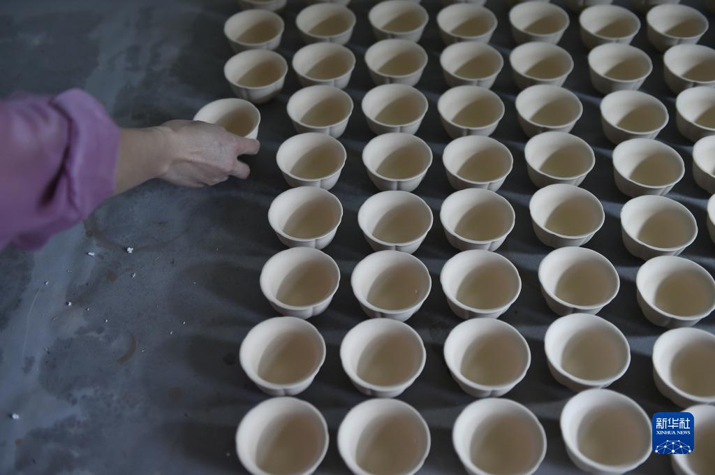8月31日,在清涼寺村的一家汝瓷生產(chǎn)企業(yè),工作人員在車(chē)間里擺放素坯。